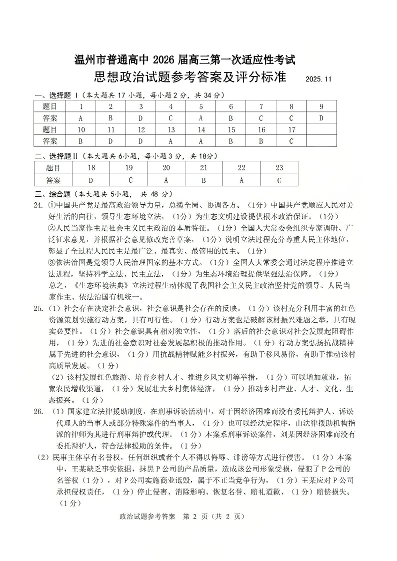 温州市普通高中2026届高三第一次适应性考试政治答案.pdf