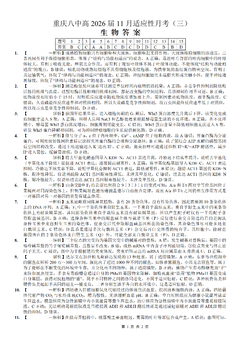重庆市第八中学2026届高考适应性月考卷(三)生物答案.pdf