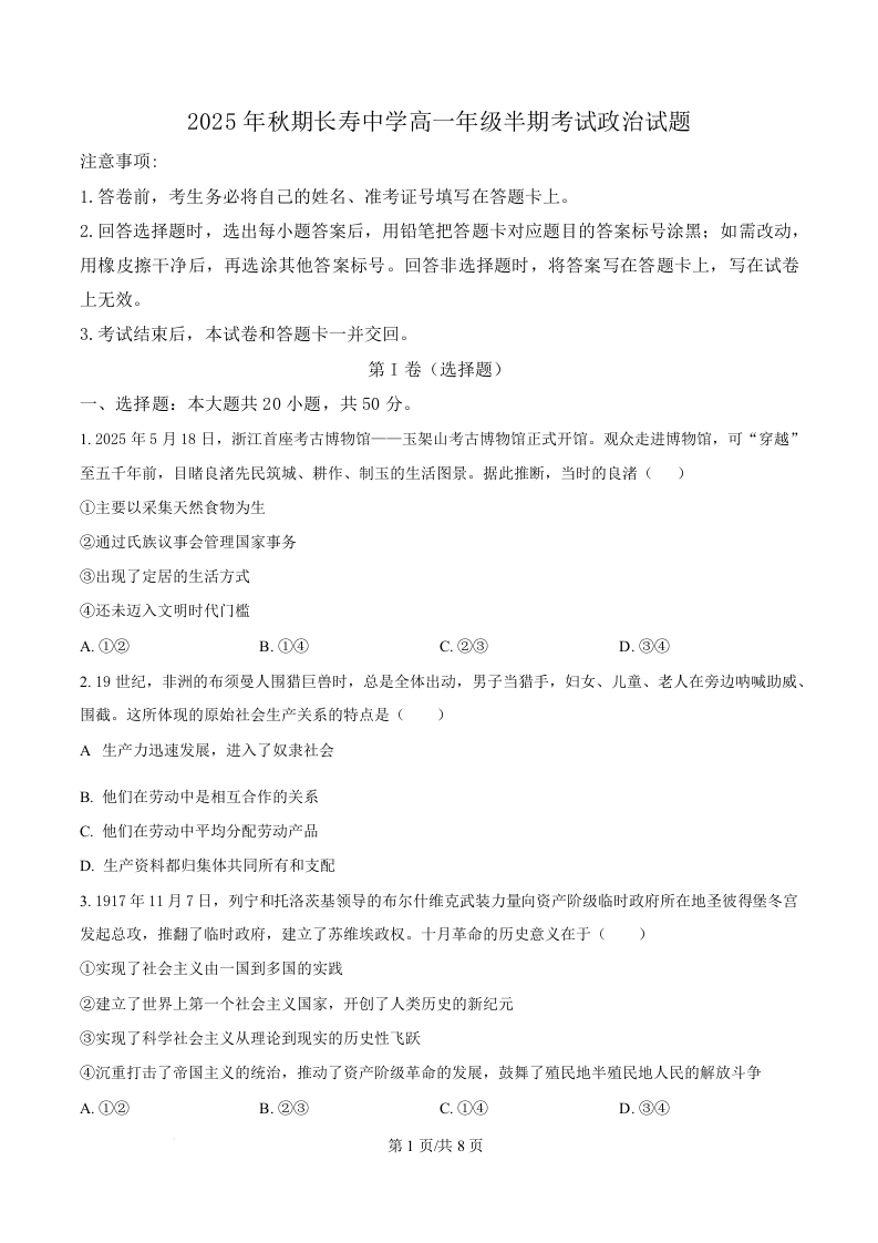 重庆市长寿中学2025-2026学年高一上学期11月期中考试 政治.docx