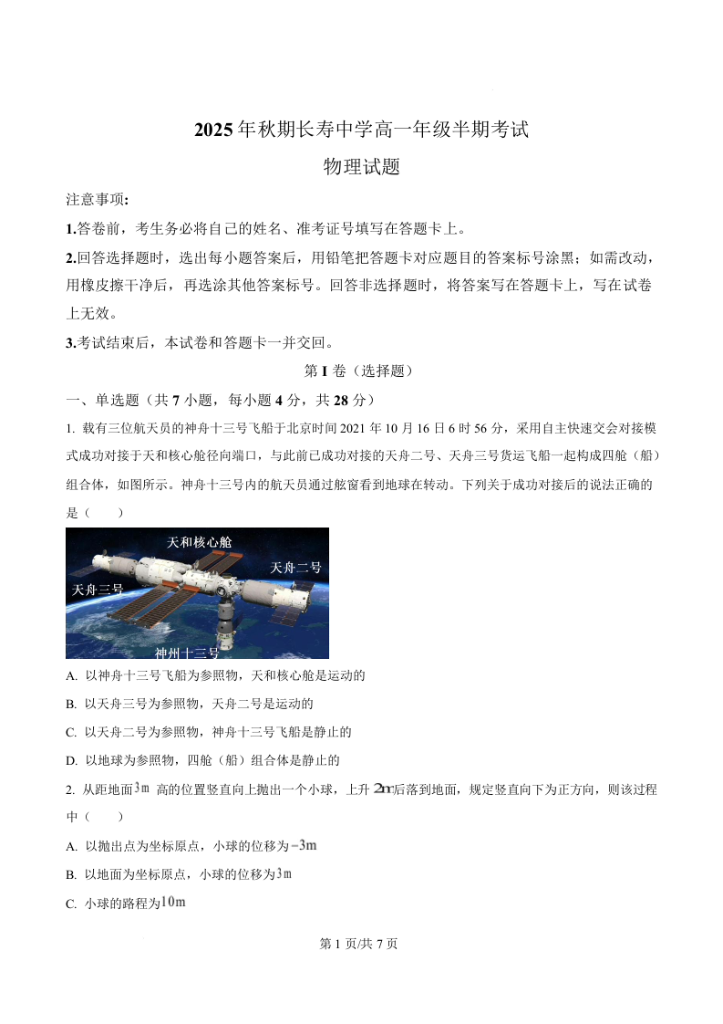 重庆市长寿中学2025-2026学年高一上学期11月期中考试 物理.docx
