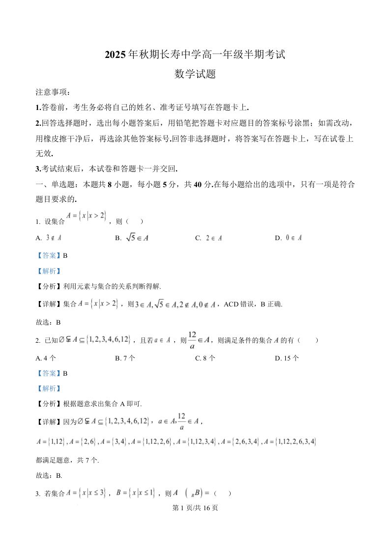 重庆市长寿中学2025-2026学年高一上学期11月期中考试 数学答案.docx