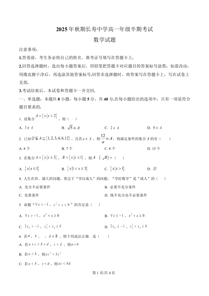 重庆市长寿中学2025-2026学年高一上学期11月期中考试 数学.docx