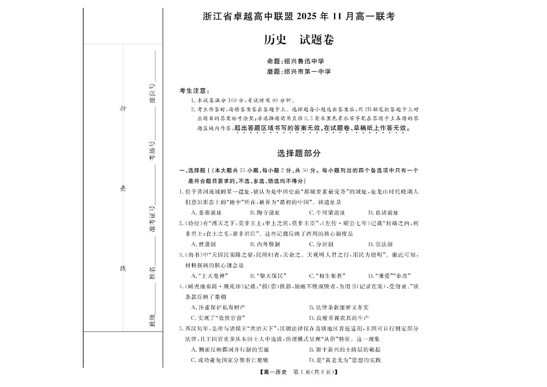 浙江省卓越高中联盟2025-2026学年高一上学期11月期中联考 历史试题(含答案).pdf