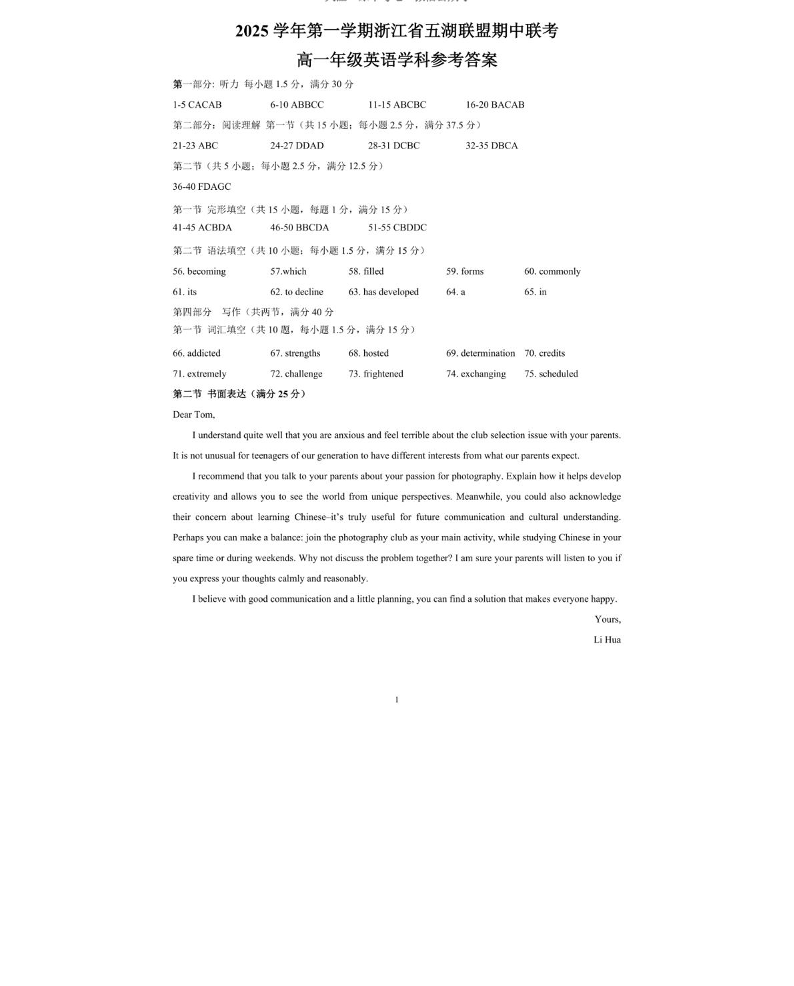 浙江省五湖联盟2025-2026学年高一上学期期中联考 英语答案.pdf