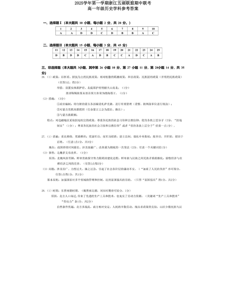 浙江省五湖联盟2025-2026学年高一上学期期中联考 历史答案.pdf