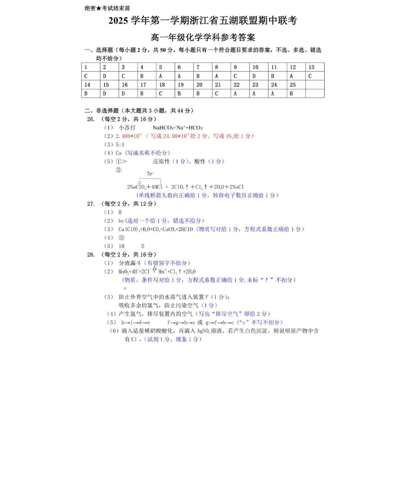 浙江省五湖联盟2025-2026学年高一上学期期中联考 化学答案.pdf