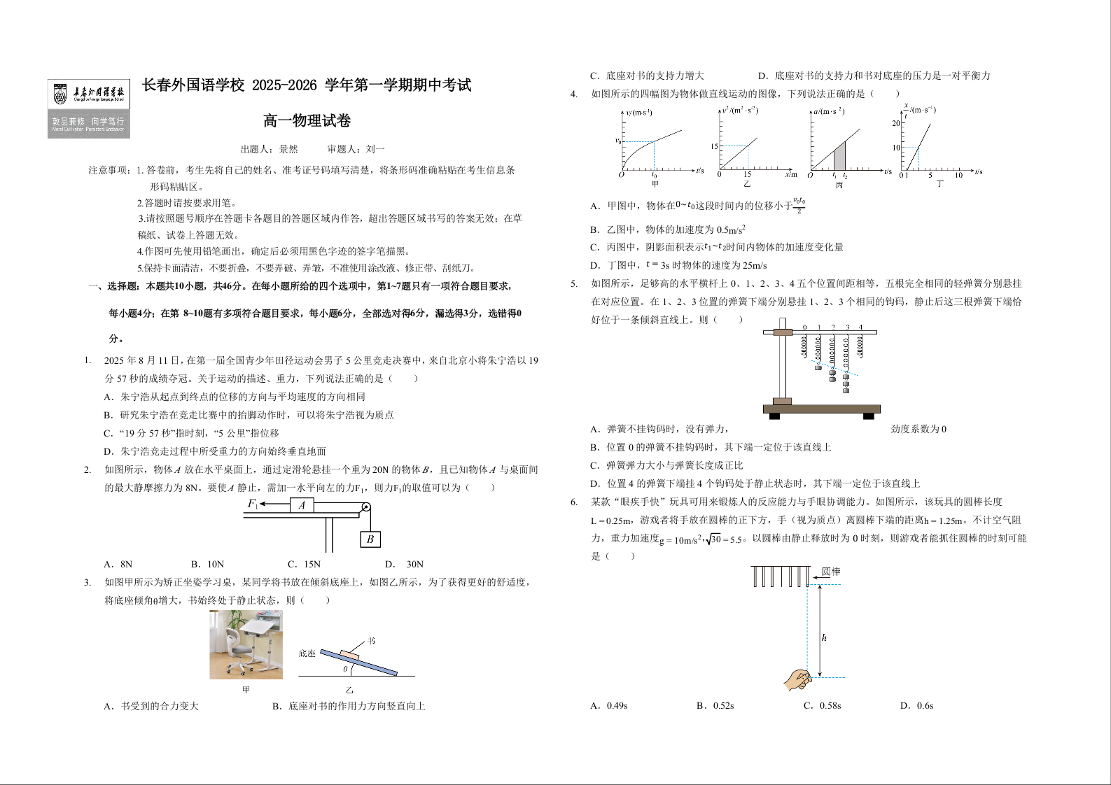 吉林省长春外国语学校2025-2026学年高一上学期期中考试 物理试题(含答案).docx