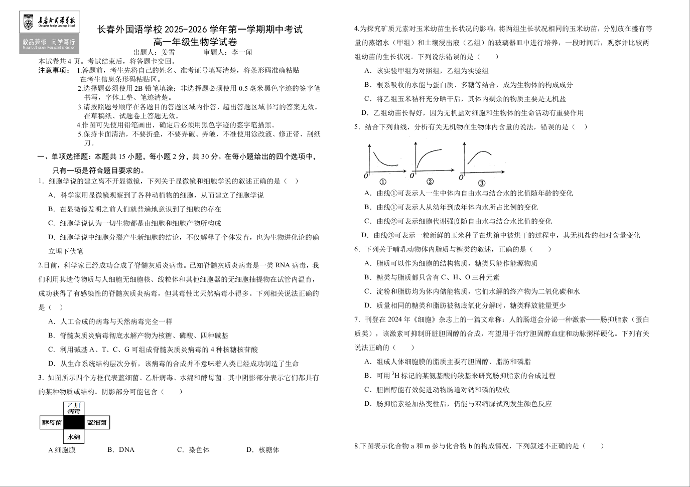 吉林省长春外国语学校2025-2026学年高一上学期期中考试 生物试题(含答案).docx