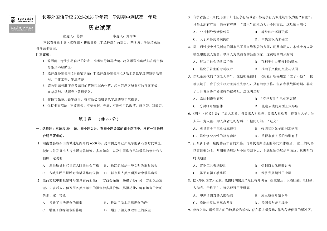 吉林省长春外国语学校2025-2026学年高一上学期期中考试 历史试题(含答案).docx