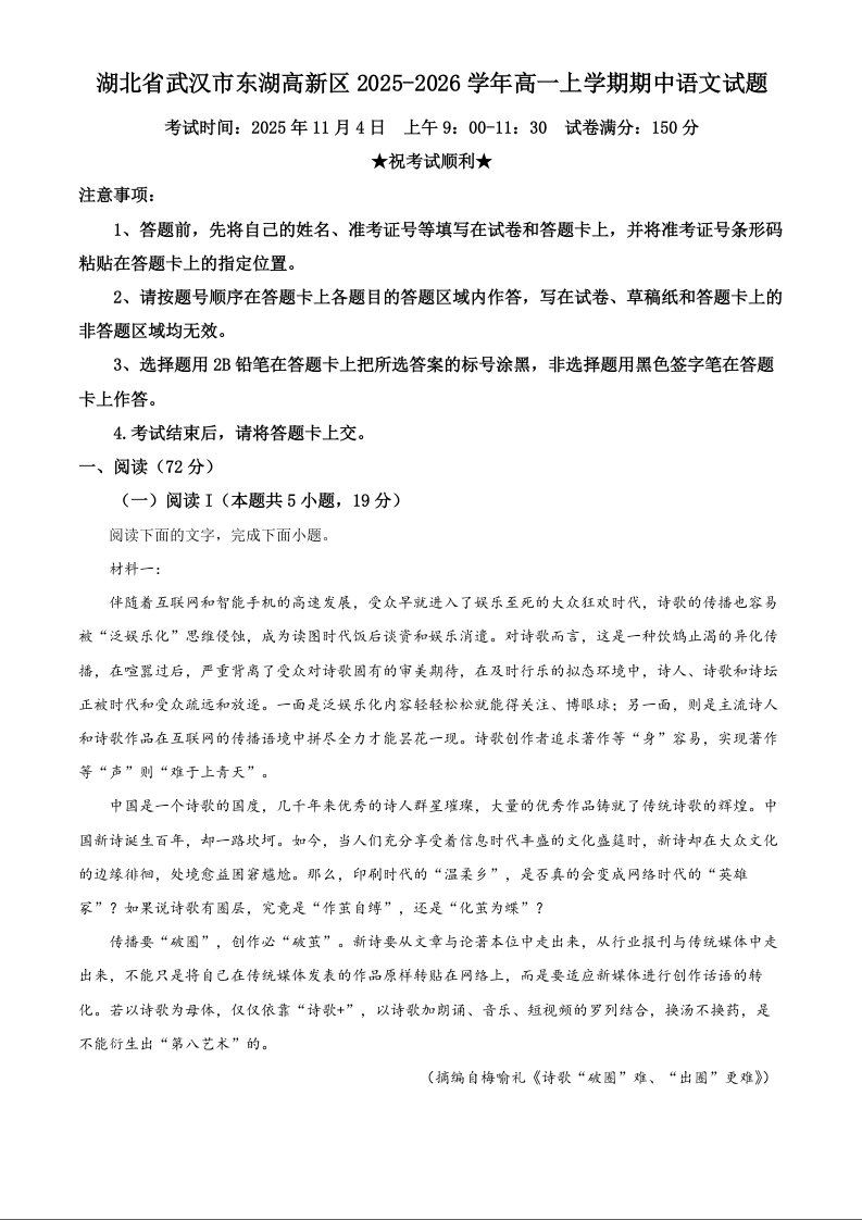 湖北省武汉市东湖高新区2025-2026学年高一上学期期中考试 语文答案.docx