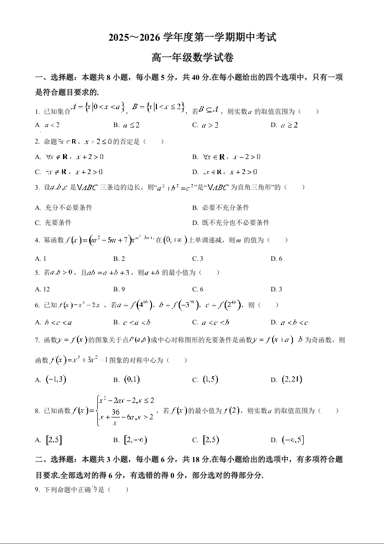 湖北省武汉市东湖高新区2025-2026学年高一上学期期中考试 数学.docx