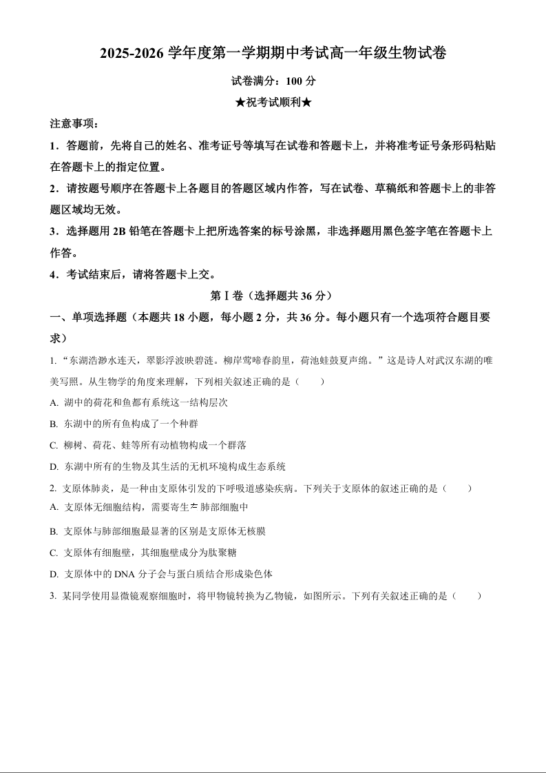 湖北省武汉市东湖高新区2025-2026学年高一上学期期中考试 生物.docx