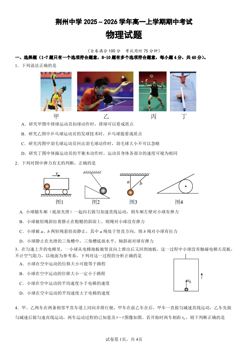 湖北省荆州中学2025-2026学年高一上学期期中考试 物理.pdf