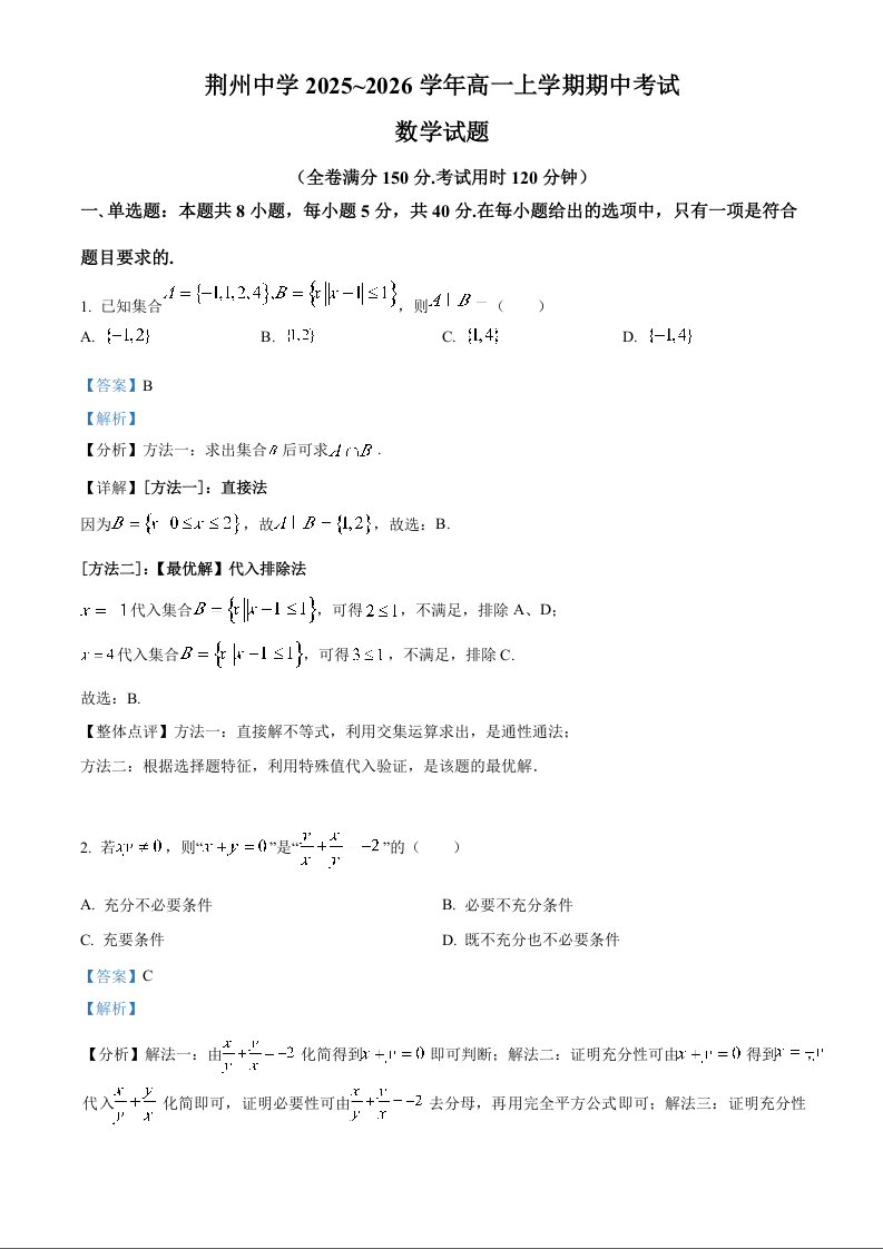 湖北省荆州中学2025-2026学年高一上学期期中考试 数学答案.docx