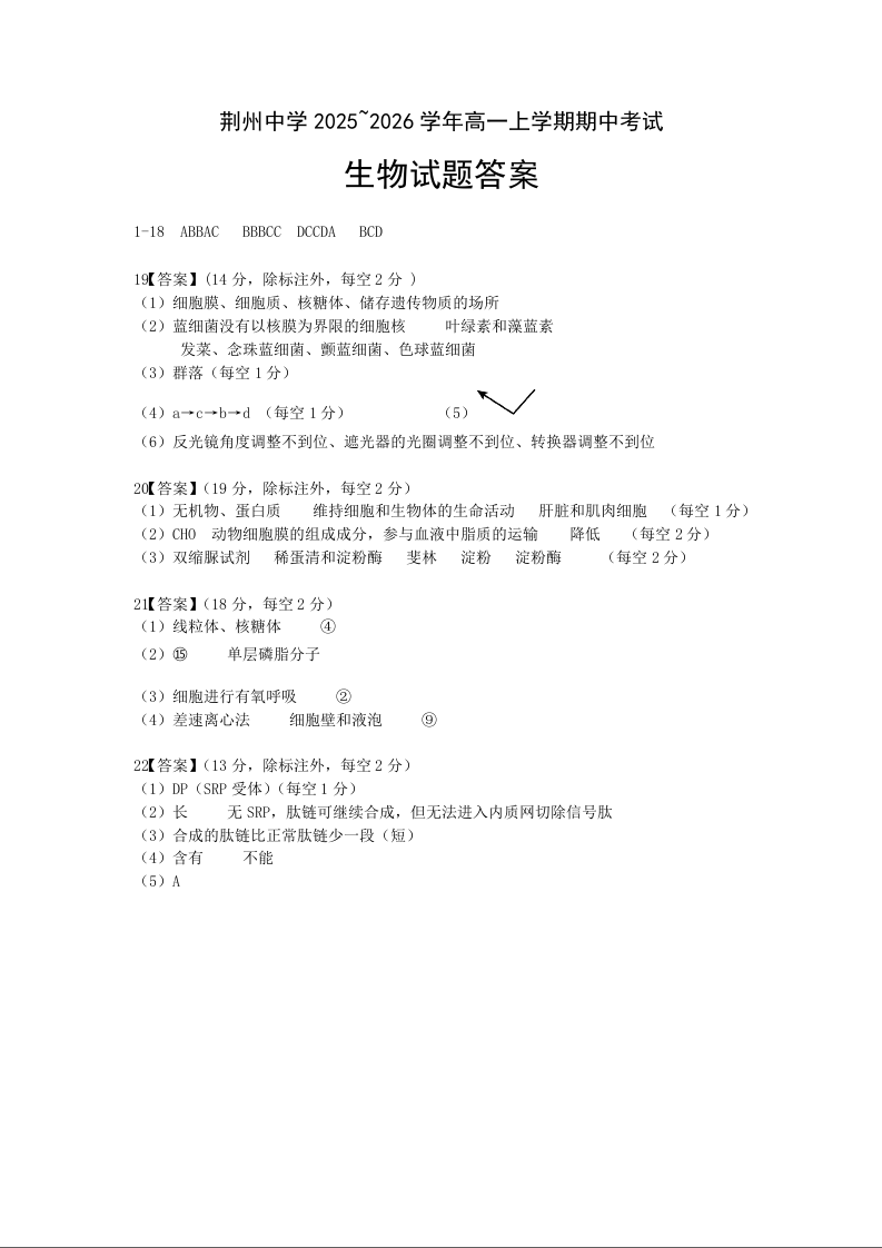湖北省荆州中学2025-2026学年高一上学期期中考试 生物答案.docx