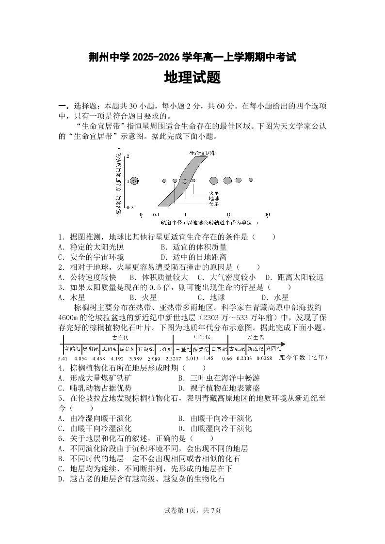 湖北省荆州中学2025-2026学年高一上学期期中考试 地理.pdf