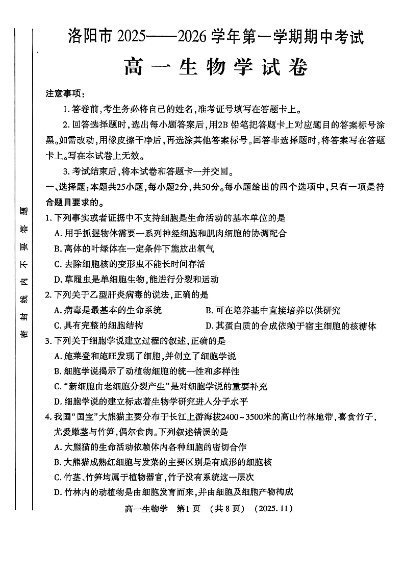 河南省洛阳市2025-2026学年高一上学期期中考试 生物.pdf
