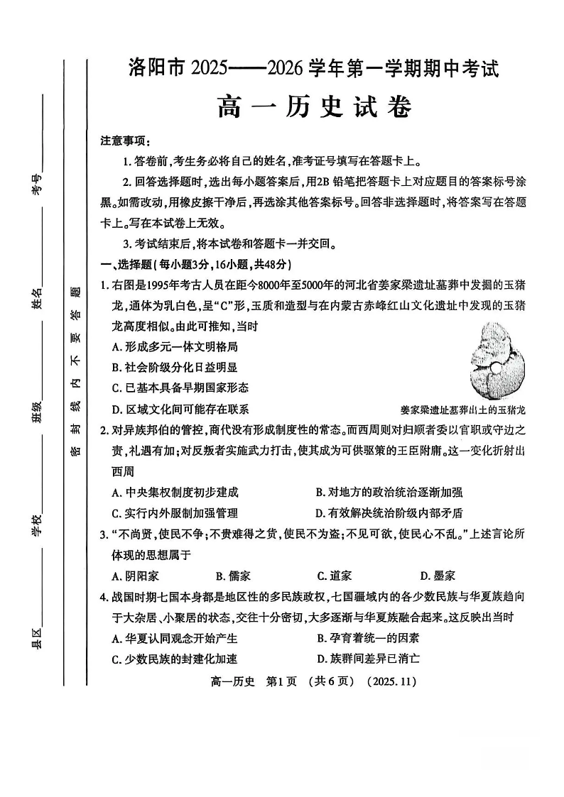 河南省洛阳市2025-2026学年高一上学期期中考试 历史试题(含答案).pdf