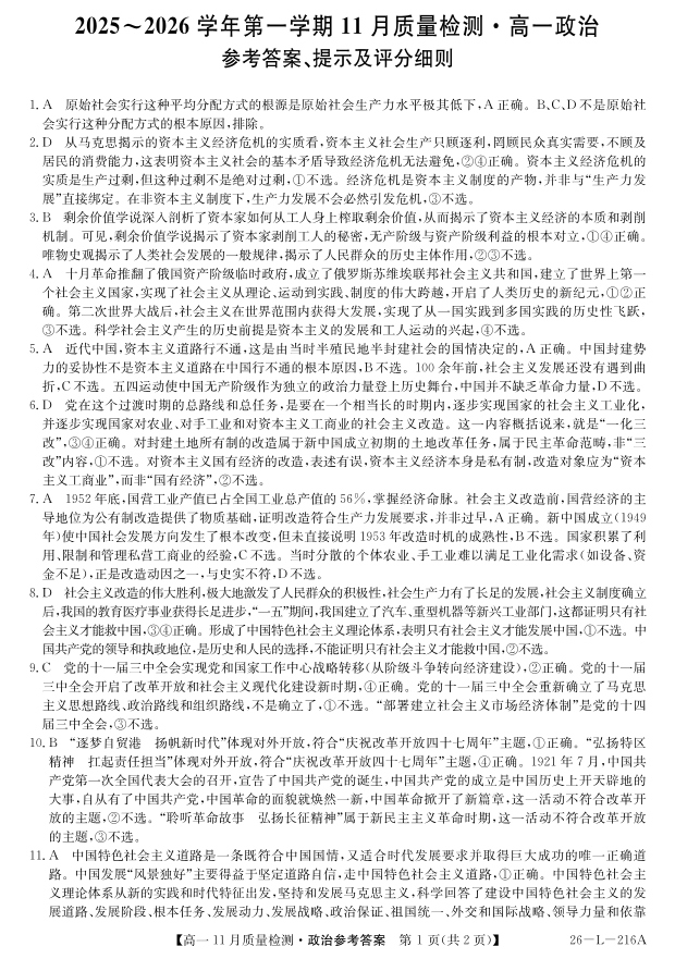 安徽省县中联盟2025-2026学年第一学期高一期中考试-政治答案.pdf