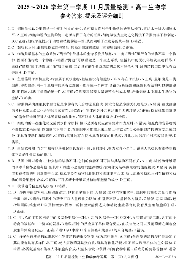 安徽省县中联盟2025-2026学年第一学期高一期中考试-生物答案.pdf