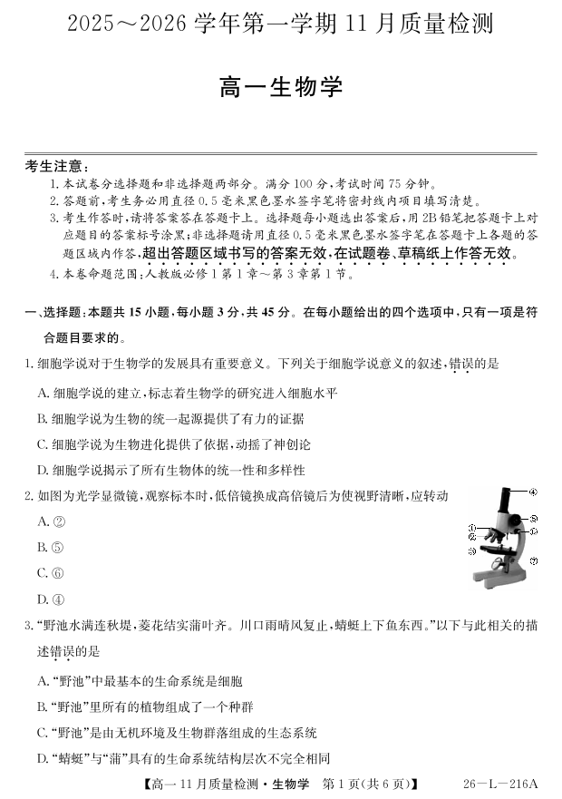 安徽省县中联盟2025-2026学年第一学期高一期中考试-生物.pdf