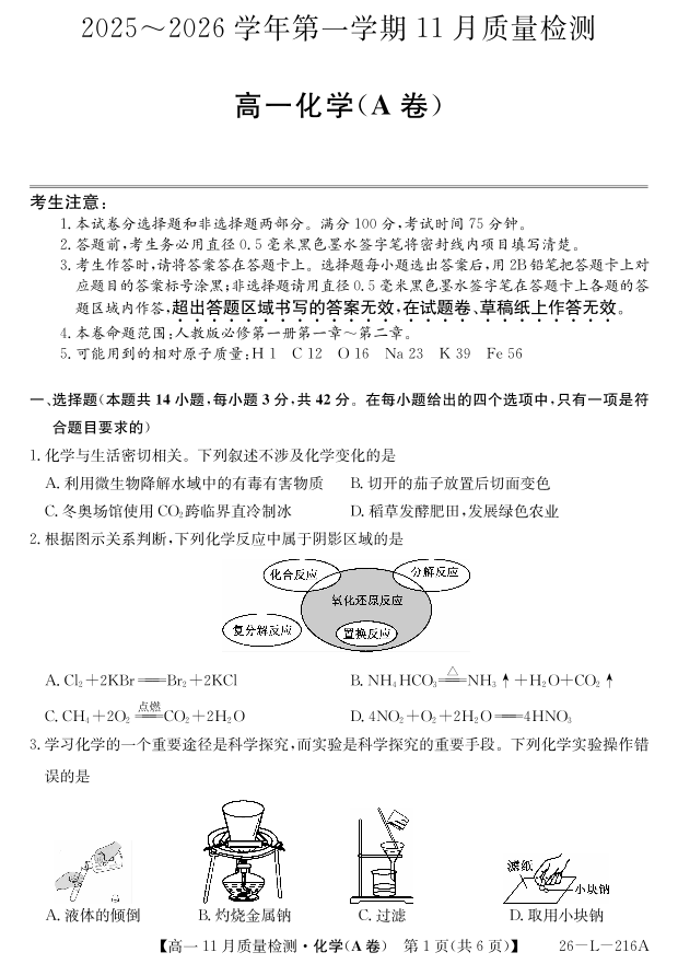 安徽省县中联盟2025-2026学年第一学期高一期中考试-化学(A卷).pdf