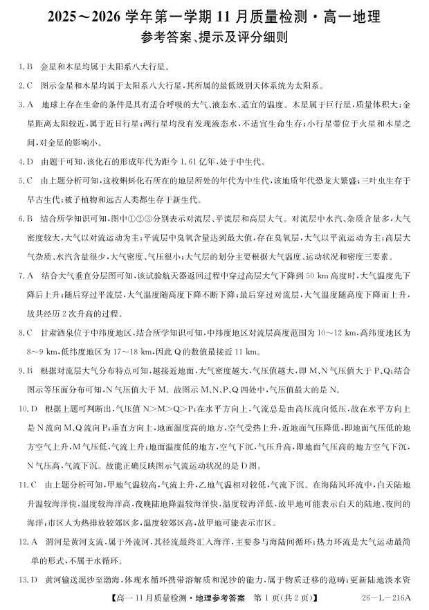 安徽省县中联盟2025-2026学年第一学期高一期中考试-地理答案.pdf