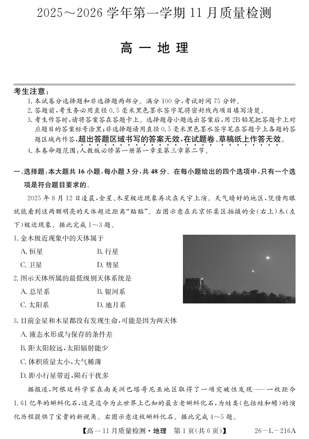 安徽省县中联盟2025-2026学年第一学期高一期中考试-地理.pdf