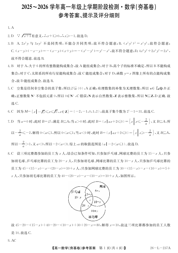 安徽省江淮名校2025-2026学年高一上学期阶段联考-数学答案(夯基卷).pdf