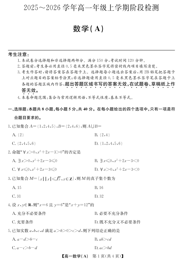 安徽省江淮名校2025-2026学年高一上学期阶段联考-数学(冲本卷A).pdf