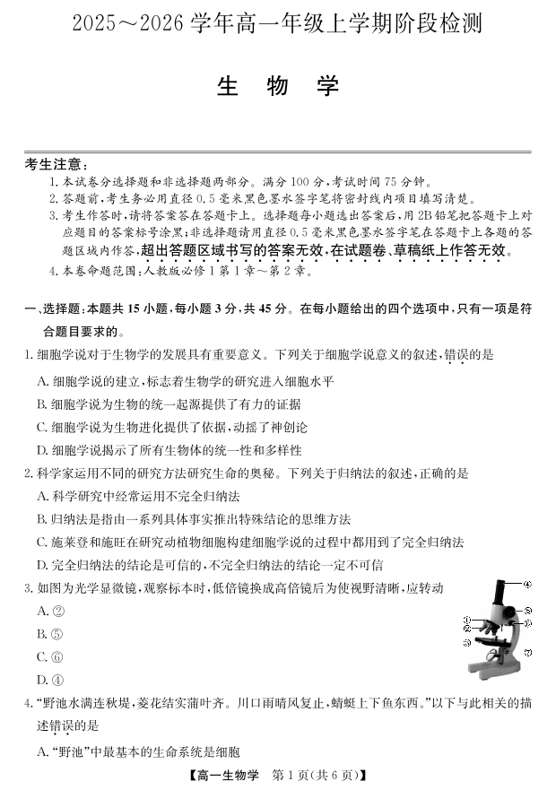 安徽省江淮名校2025-2026学年高一上学期阶段联考-生物.pdf