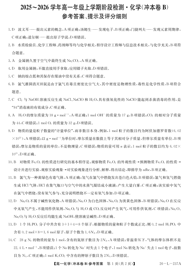 安徽省江淮名校2025-2026学年高一上学期阶段联考-化学答案(冲本B).pdf