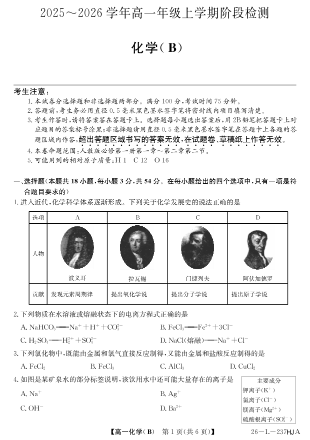 安徽省江淮名校2025-2026学年高一上学期阶段联考-化学(夯基B).pdf