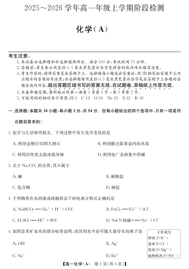 安徽省江淮名校2025-2026学年高一上学期阶段联考-化学(冲本A).pdf