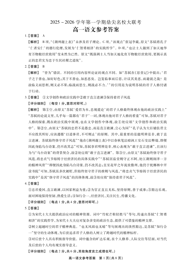 【语文答案】安徽省鼎尖名校大联考2025-2026学年上学期高一11月期中考试.pdf