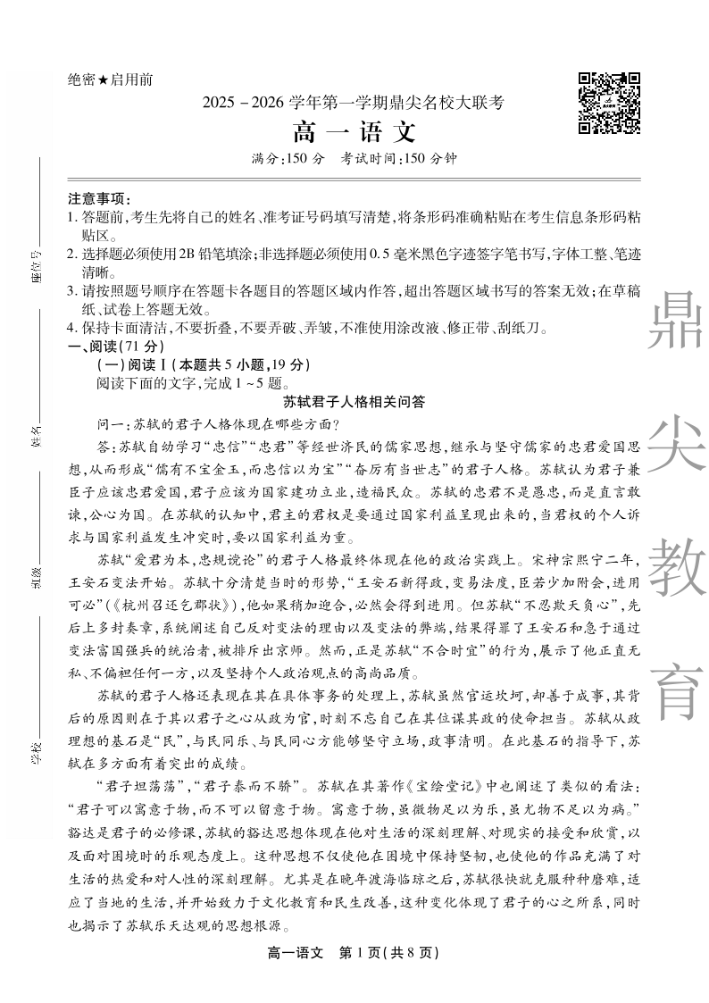 【语文】安徽省鼎尖名校大联考2025-2026学年上学期高一11月期中考试.pdf