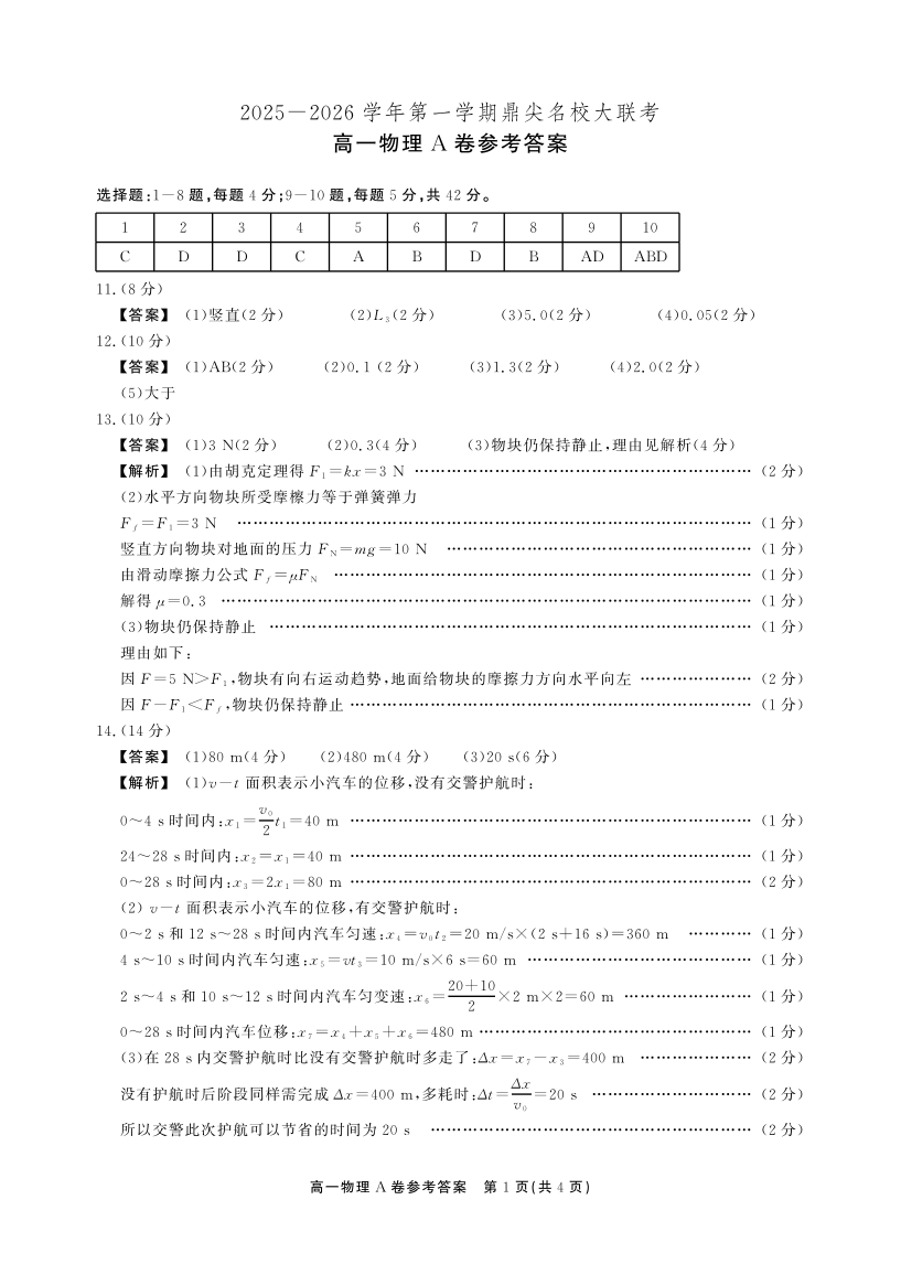 【物理A卷答案】安徽省鼎尖名校大联考2025-2026学年上学期高一11月期中考试.pdf