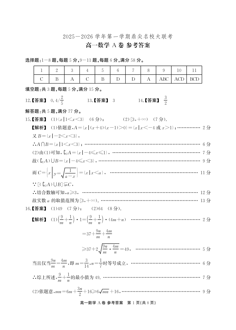 【数学A卷-答案】安徽省鼎尖名校大联考2025-2026学年上学期高一11月期中考试.pdf