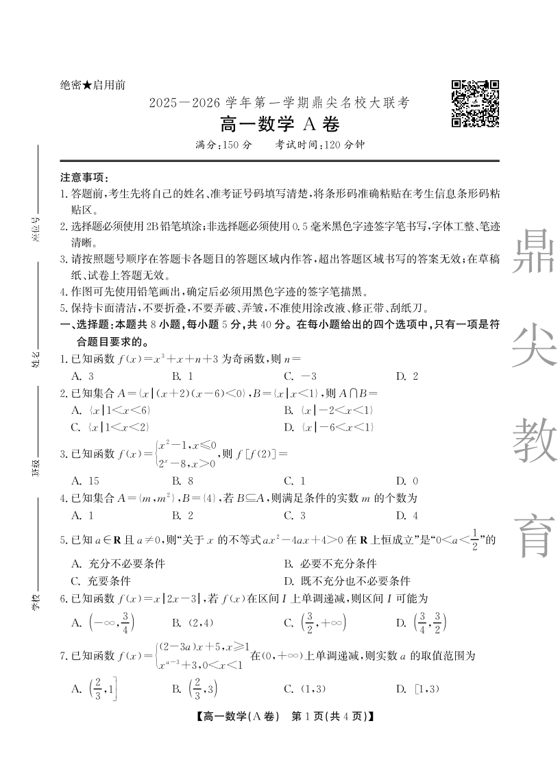 【数学A卷】安徽省鼎尖名校大联考2025-2026学年上学期高一11月期中考试.pdf