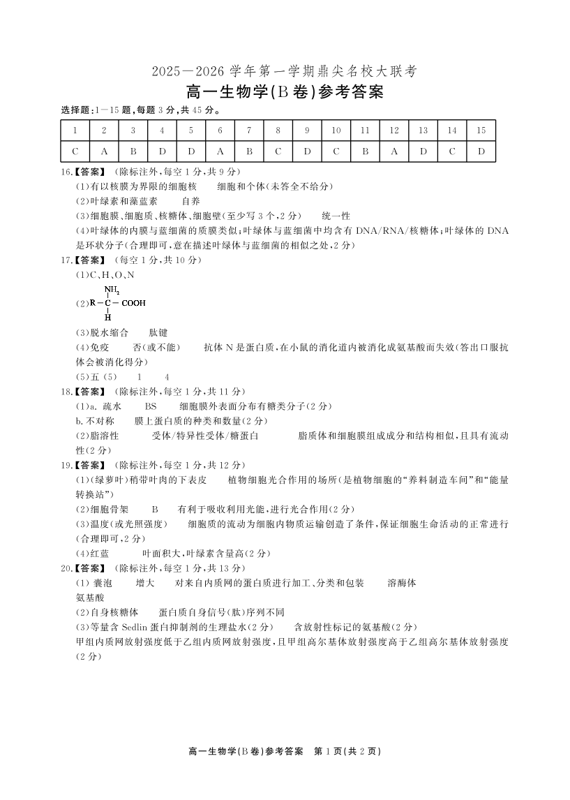 【生物B卷答案】安徽省鼎尖名校大联考2025-2026学年上学期高一11月期中考试.pdf