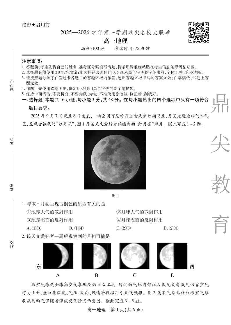 【地理】安徽省鼎尖名校大联考2025-2026学年上学期高一11月期中考试.pdf