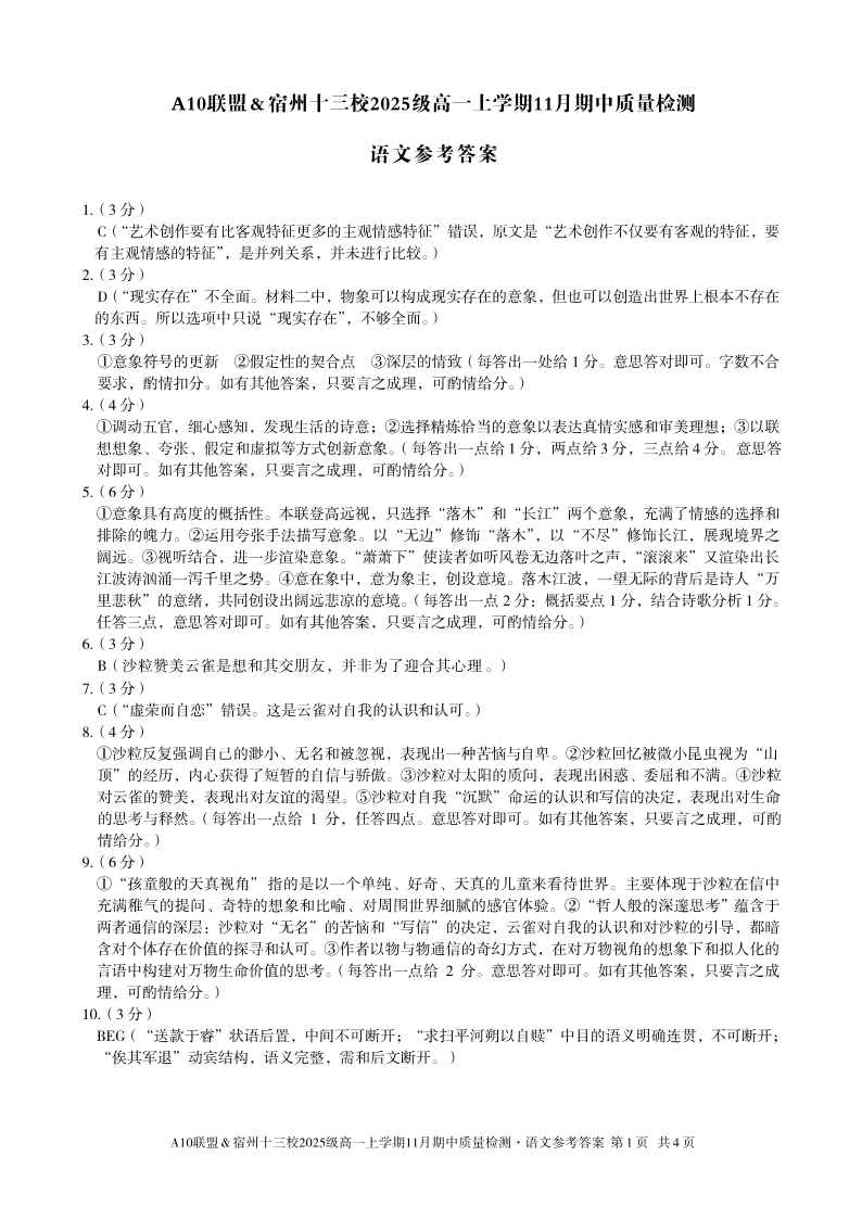 【语文答案】A10联盟&宿州十三校2025级高一上学期11月期中质量检测语文答案.pdf