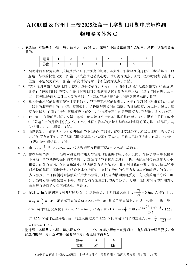 【物理答案】(C卷)A10联盟&宿州十三校2025级高一上学期11月期中质量检测物理答案C.pdf