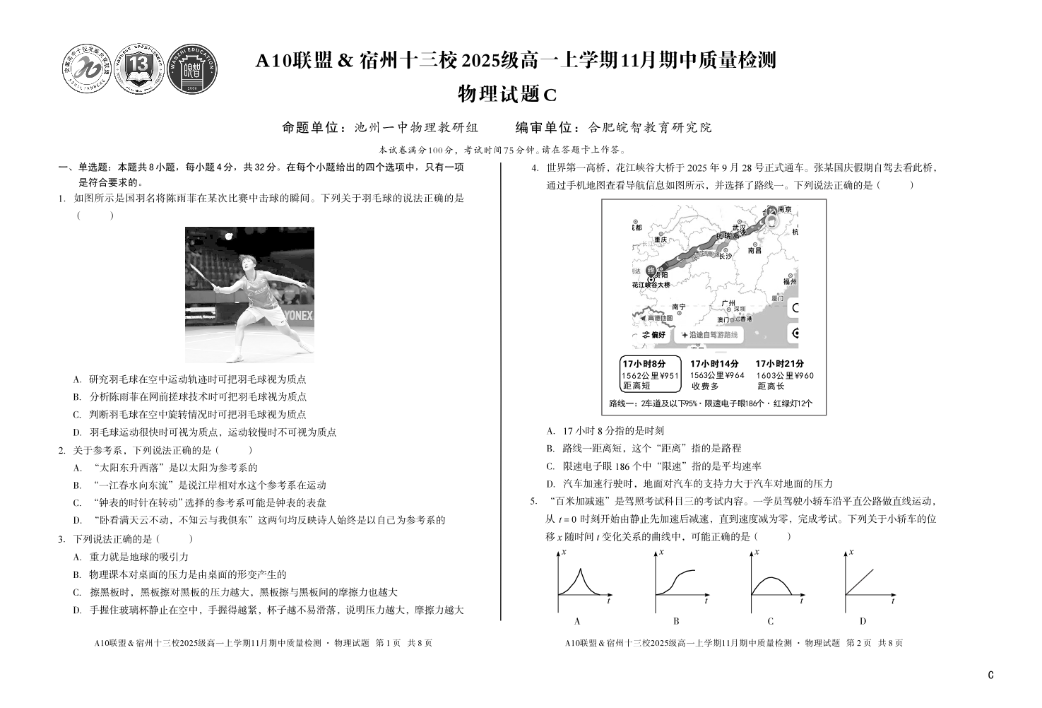 【物理】(C卷)A10联盟&宿州十三校2025级高一上学期11月期中质量检测物理C.pdf
