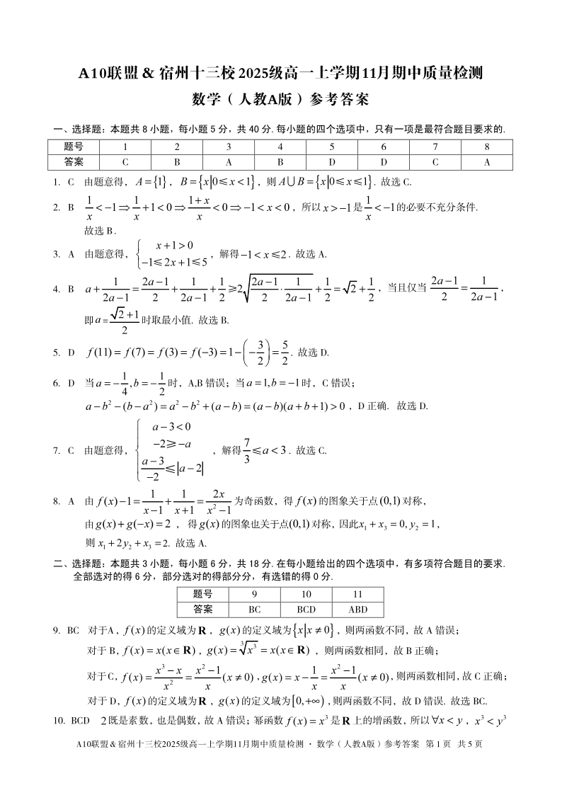 【数学答案】A10联盟&宿州十三校2025级高一上学期11月期中质量检测数学(人教A版)答案.pdf