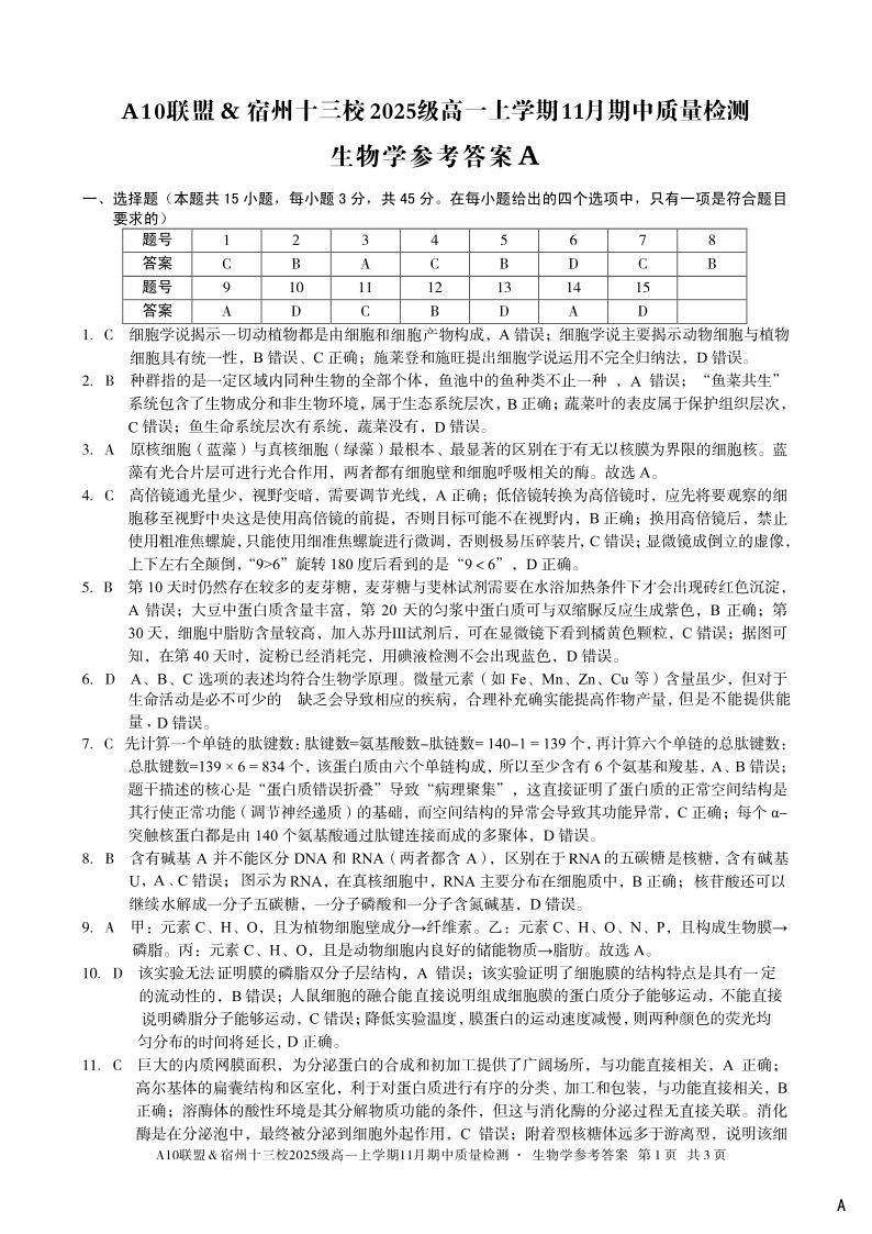 【生物学答案】(A卷)A10联盟&宿州十三校2025级高一上学期11月期中质量检测生物学答案a.pdf