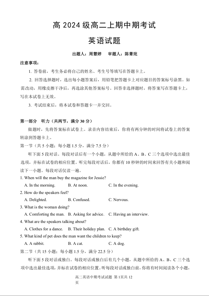 重庆市万州二中2025-2026学年高二上学期期中考试 英语.docx