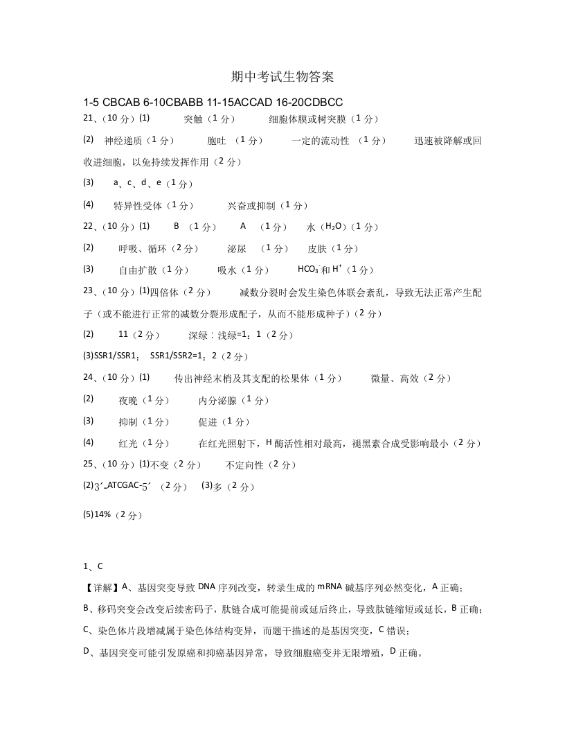 重庆市万州二中2025-2026学年高二上学期期中考试 生物答案.docx
