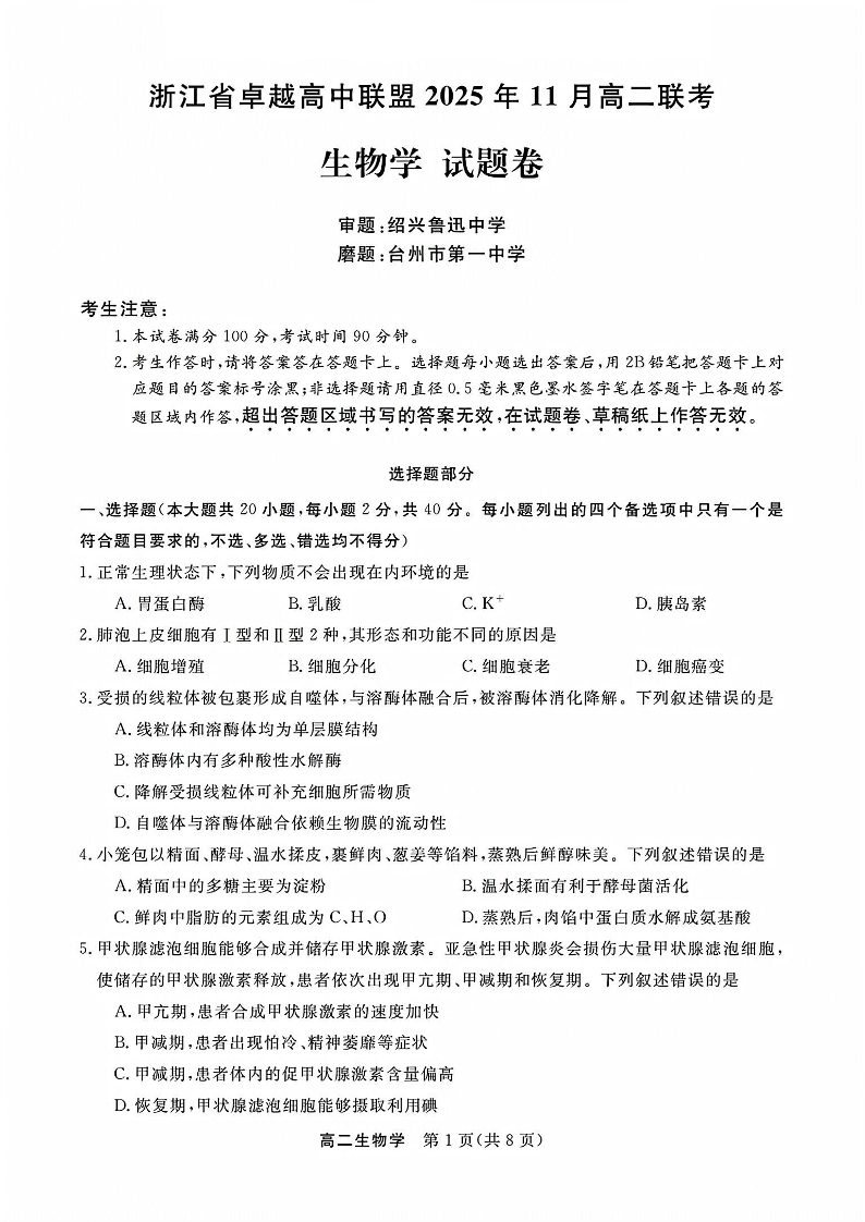 浙江省卓越高中联盟2025-2026学年高二上学期11月期中联考 生物.pdf