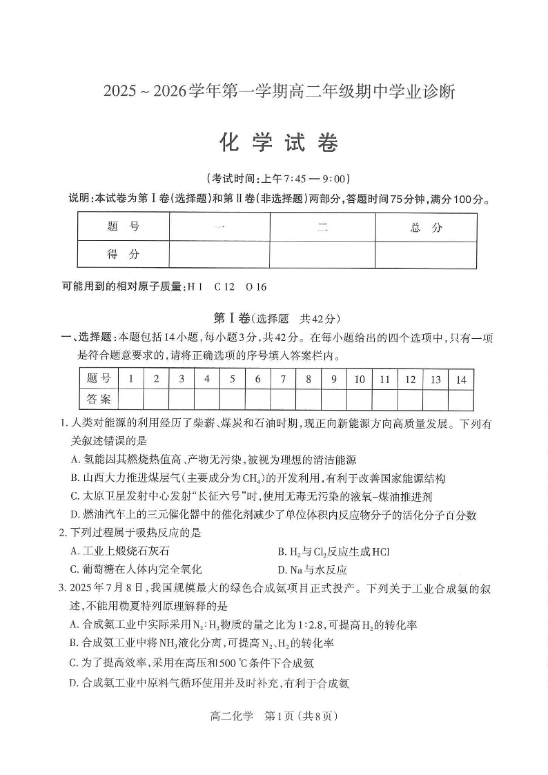 【化学】太原市2025-2026学年第一学期高二年级期中学业诊断.pdf
